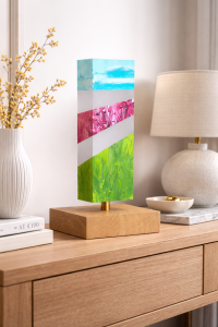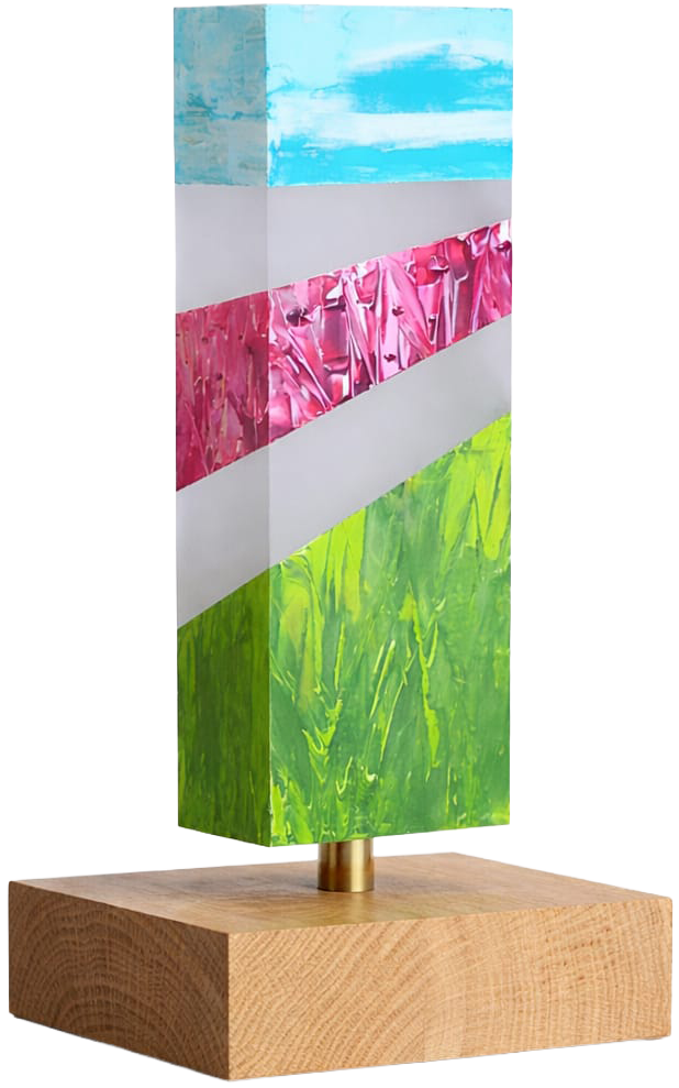 Dit object is vervaardigd uit acrylaat, waarvan 3 zijden zijn gesatineerd, het object is gemonteerd op een houten ondergrond.